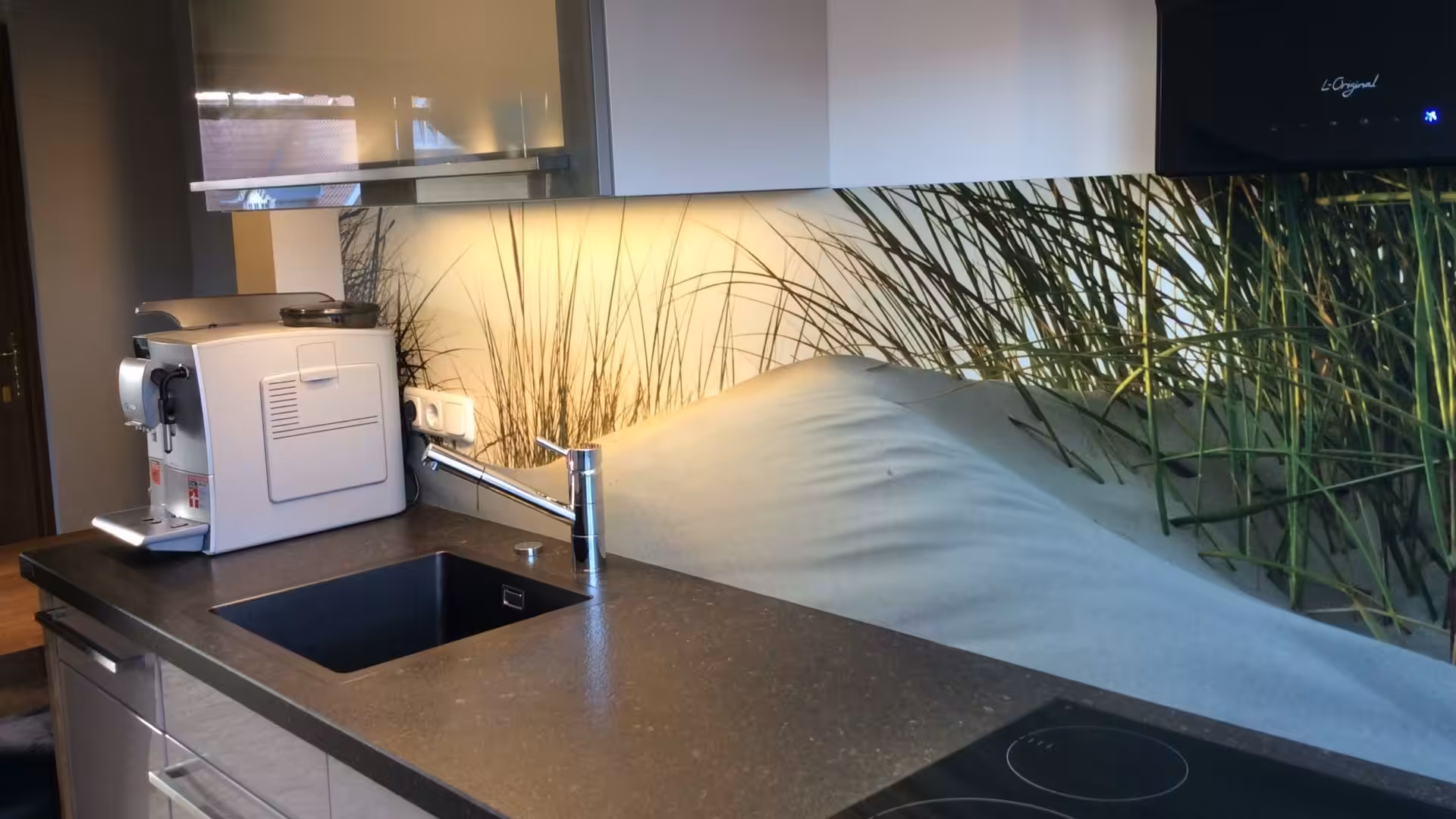Apartment Strandgut 2 Personen Küche mit Kaffeevollautomat Doppelbett Duschbad Flachbildfernseher im Wohnzimmer Flachbildfernseher im Schlafzimmer Internet über WLAN Duschbad Balkon Backofen mit Mikrowelle Geschirrspülmaschine Induktionskochfeld Nichtraucher-Apartment